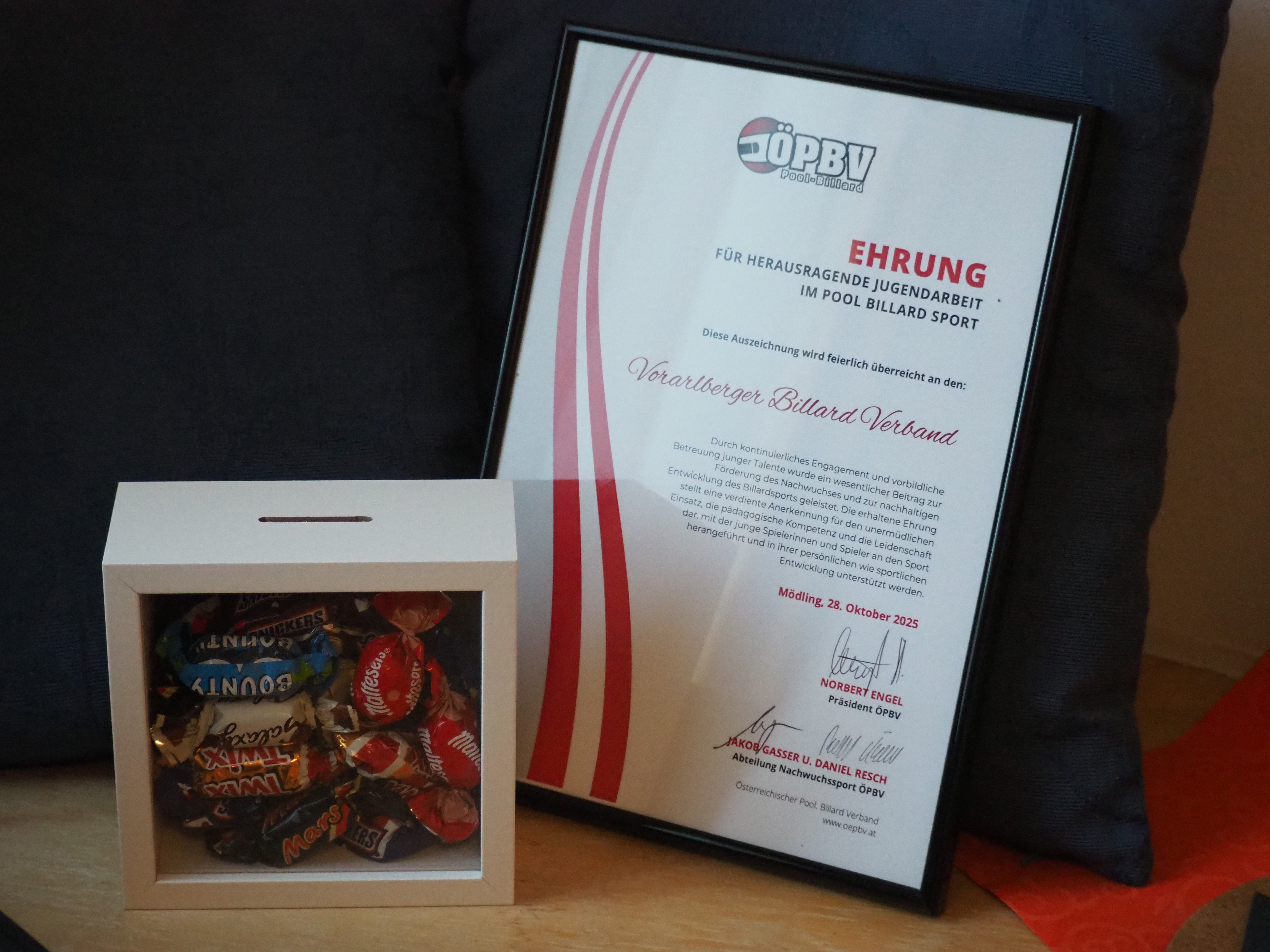 Auch wenn diese Ehrung offiziell dem Vorarlberger Billardverband übergeben wurde, wissen wir genau, wem sie in Wahrheit gebührt: den Menschen, die mit Herz, Zeit und Hingabe unsere Jugendlichen begleiten.